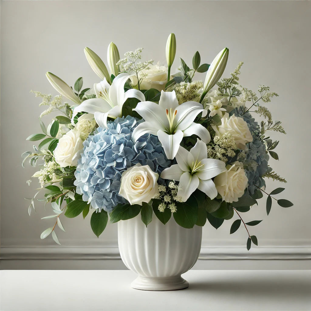 The "Comforting Peace" sympathy arrangement is a graceful and serene floral display, thoughtfully designed to offer comfort and support during times of loss. This arrangement features a gentle blend of white lilies, white roses, and soft blue hydrangeas, arranged in a balanced and slightly elevated design. Accented with lush green foliage and delicate white filler flowers, the arrangement is set in a classic white ceramic vase, symbolizing purity and peace. The calming colors and natural beauty of the flowers create a comforting presence, making this arrangement an ideal expression of heartfelt condolences. The simple, neutral background ensures that all attention is focused on the soothing and dignified floral tribute, perfect for showing sympathy and support.