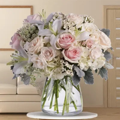 The Elegance in Bloom Vase Arrangement is a sophisticated and graceful display of nature's finest flowers, perfect for adding a touch of beauty to any space. This stunning arrangement features three elegant stems of white lilies, symbolizing purity and renewal, complemented by ten delicate pink roses, which convey admiration and joy. The bouquet is further enhanced with three stems of pristine white alstroemeria, known for their longevity and charm, and three lush stems of white hydrangeas, adding a touch of softness and fullness. Accented with tasteful fillers, this arrangement is beautifully presented in a classic vase, making it an ideal choice for special occasions, heartfelt gestures, or simply to brighten up your home with timeless elegance.