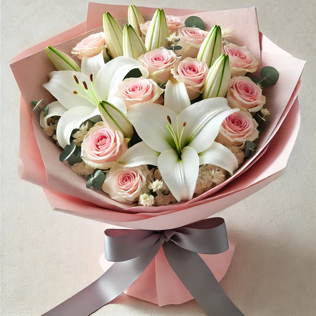 A graceful bouquet featuring soft pink roses and pristine white lilies, beautifully wrapped for a touch of sophistication. Perfect for any occasion that calls for elegance and charm.