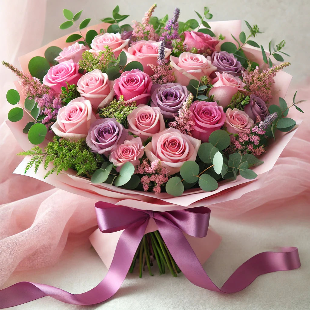 A stunning arrangement of 24 pink, hot pink, and lavender roses, beautifully wrapped to create a bouquet full of charm and elegance. Ideal for making a lasting impression on any special occasion.