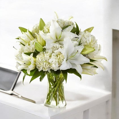 The "Pure Elegance" bouquet is a stunning display of serene beauty and grace, featuring a harmonious blend of white lilies and hydrangeas. This sophisticated arrangement captures the essence of purity and tranquility, making it an ideal choice for expressing sympathy, offering congratulations, or simply adding a touch of elegance to any space. The crisp white blooms are arranged in a clear glass vase, allowing their natural beauty to shine through. Whether as a gesture of respect or a thoughtful gift, the "Pure Elegance" bouquet conveys a message of peace, purity, and timeless grace.