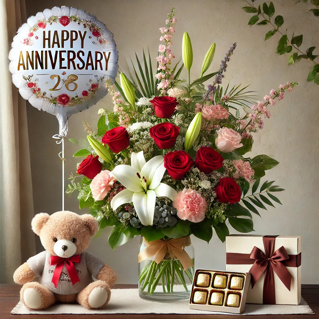 The Romantic Anniversary Celebration Set is a beautifully curated gift set, perfect for making a special anniversary unforgettable. This elegant set includes a stunning floral arrangement featuring a mix of deep red roses, pristine white lilies, and soft pink carnations, all artfully arranged in a clear glass vase with lush green foliage. Accompanying the bouquet is a plush and cuddly teddy bear, adding a touch of warmth and comfort. A box of chocolates, elegantly wrapped, sits beside the bear, offering a sweet indulgence. Floating above the arrangement is a festive "Happy Anniversary" Mylar balloon, adding a joyful and celebratory element to the display. This gift set is the perfect combination of romance, thoughtfulness, and celebration, making it an ideal choice for commemorating a special anniversary.