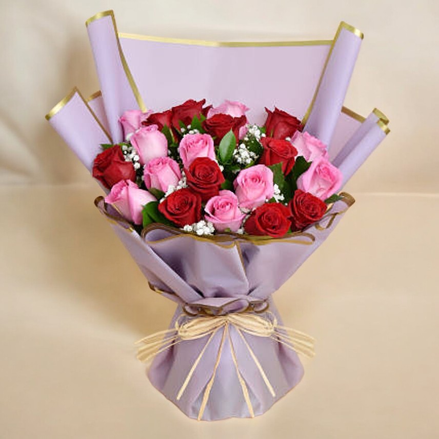 The "Romantic Harmony" bouquet is a captivating blend of pink and red 24 roses, artfully arranged to express love, admiration, and affection. This stunning bouquet features an elegant mix of soft pink roses symbolizing grace and sweetness, alongside deep red roses representing deep love and passion. Wrapped in delicate lavender tissue paper with golden edges, and tied with a refined bow, this bouquet exudes sophistication and charm. Accented with baby's breath, this bouquet is perfect for romantic occasions, anniversaries, or any moment when you want to make a lasting impression with a gesture of love and elegance.