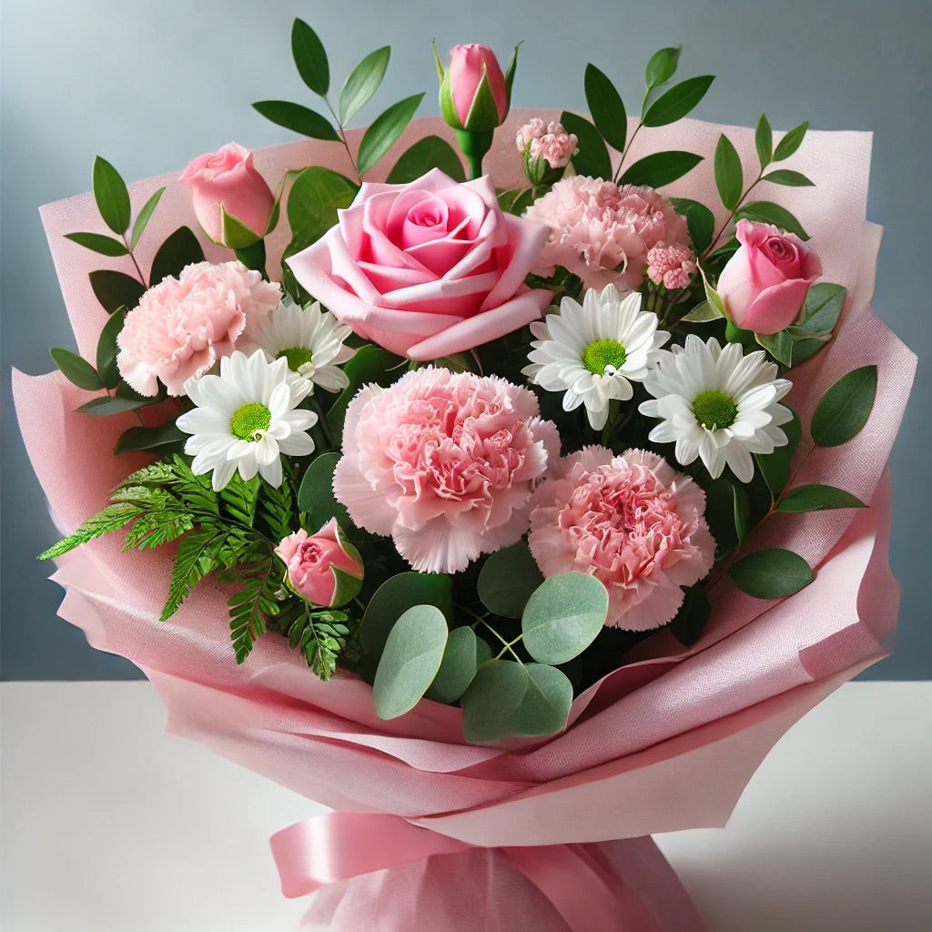 This beautifully arranged bouquet features a delightful mix of soft pink roses, delicate pink carnations, and crisp white daisies, all complemented by lush green foliage. Wrapped elegantly in pink tissue paper, this bouquet exudes a sense of grace and charm. Perfect for expressing love, appreciation, or simply brightening someone’s day, this floral arrangement is sure to bring joy and warmth to any occasion. Ideal for birthdays, anniversaries, or as a thoughtful gift, it combines classic beauty with a modern touch.